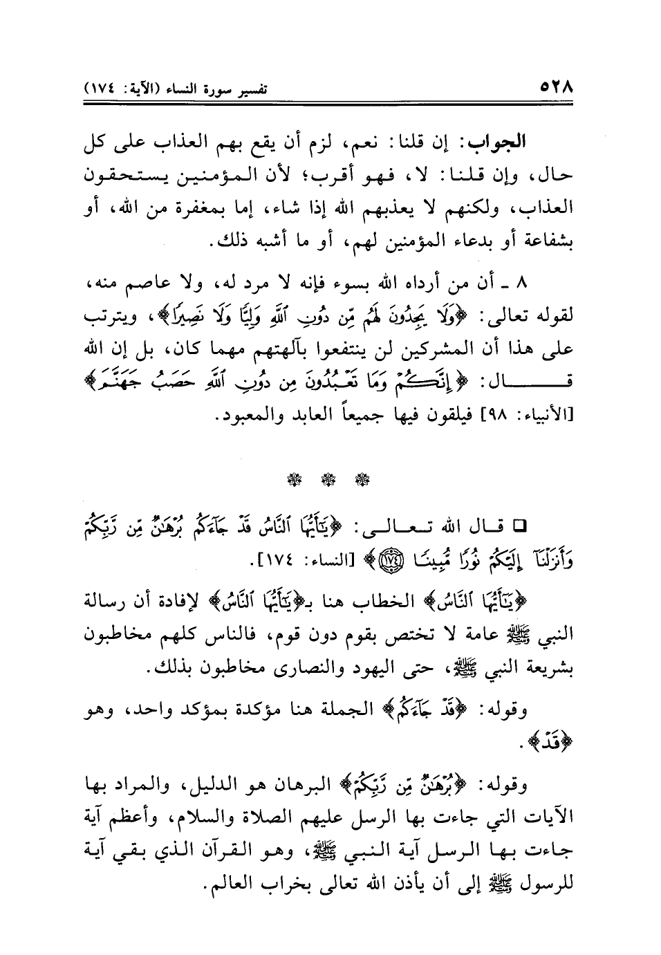 * قال الله تعالى: {يَاأَيُّهَا النَّاسُ قَدْ جَاءَكُمْ بُرْهَانٌ مِنْ رَبِّكُمْ وَأَنْزَلْنَا إِلَيْكُمْ نُورًا مُبِينًا (١٧٤)} [النساء: ١٧٤].
