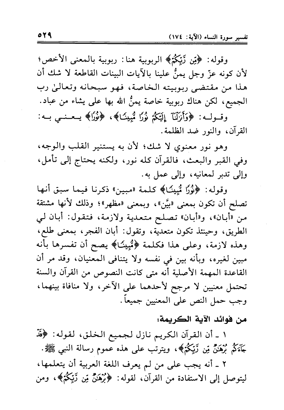 وقوله: {نُورًا مُبِينًا} كلمة "مبين" ذكرنا فيما سبق أنها تصلح أن تكون بمعنى "بيَّن"، وبمعنى "مظهر"؛ وذلك لأنها مشتقة من "أبان"، و"أبان" تصلح متعدية ولازمة، فتقول: أبان لي الطريق، وحينئذ تكون متعدية، وتقول: أبان الفجر، بمعنى طلع، وهذه لازمة، وعلى هذا فكلمة {مُبِينًا} يصح أن تفسرها بأنه مبين لغيره، وبأنه بين في نفسه ولا يتنافى المعنيان، وقد مر أن القاعدة المهمة الأصلية أنه متى كانت النصوص من القرآن والسنة تحتمل معنيين لا مرجح لأحدهما على الآخر، ولا منافاة بينهما، وجب حمل النص على المعنيين جميعًا.