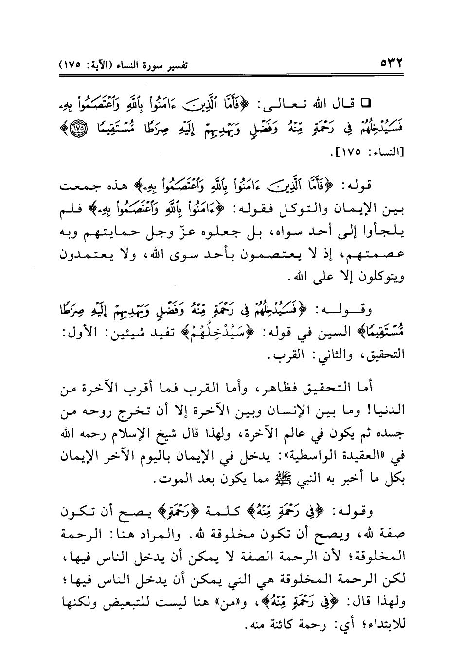 وقوله: {فَسَيُدْخِلُهُمْ فِي رَحْمَةٍ مِنْهُ وَفَضْلٍ وَيَهْدِيهِمْ إِلَيْهِ صِرَاطًا مُسْتَقِيمًا} السين في قوله: {سَيُدْخِلُهُمْ} تفيد شيئين: الأول: التحقيق، والثاني: القرب.