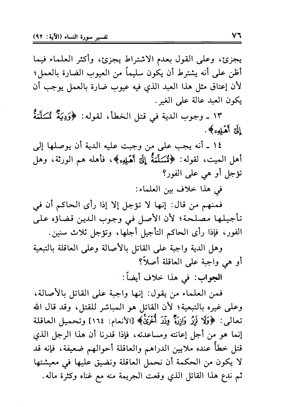 ١٣ - وجوب الدية في قتل الخطأ، لقوله: {وَدِيَةٌ مُسَلَّمَةٌ إِلَى أَهْلِهِ}.