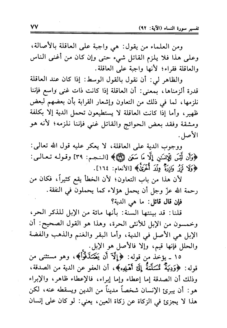 ووجوب الدية على العاقلة، لا يعكر عليه قول الله تعالى: {وَأَنْ لَيْسَ لِلْإِنْسَانِ إِلَّا مَا سَعَى (٣٩)} [النجم: ٣٩] وقوله تعالى: {وَلَا تَزِرُ وَازِرَةٌ وِزْرَ أُخْرَى} [الأنعام: ١٦٤].