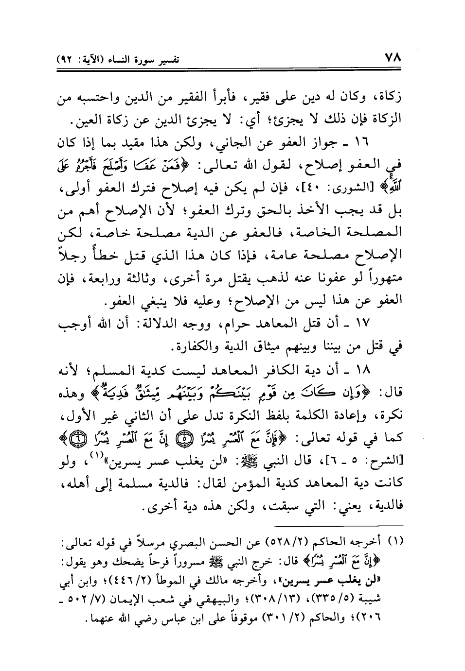 ١٨ - أن دية الكافر المعاهد ليست كدية المسلم؛ لأنه قال: {وَإِنْ كَانَ مِنْ قَوْمٍ بَيْنَكُمْ وَبَيْنَهُمْ مِيثَاقٌ فَدِيَةٌ} وهذه نكرة، وإعادة الكلمة بلفظ النكرة تدل على أن الثاني غير الأول، كما في قوله تعالى: {فَإِنَّ مَعَ الْعُسْرِ يُسْرًا (٥) إِنَّ مَعَ الْعُسْرِ يُسْرًا (٦)} [الشرح: ٥ - ٦]، قال النبي - صلى الله عليه وسلم -: "لن يغلب عسر يسرين" (¬١)، ولو كانت دية المعاهد كدية المؤمن لقال: فالدية مسلمة إلى أهله، فالدية، يعني: التي سبقت، ولكن هذه دية أخرى.