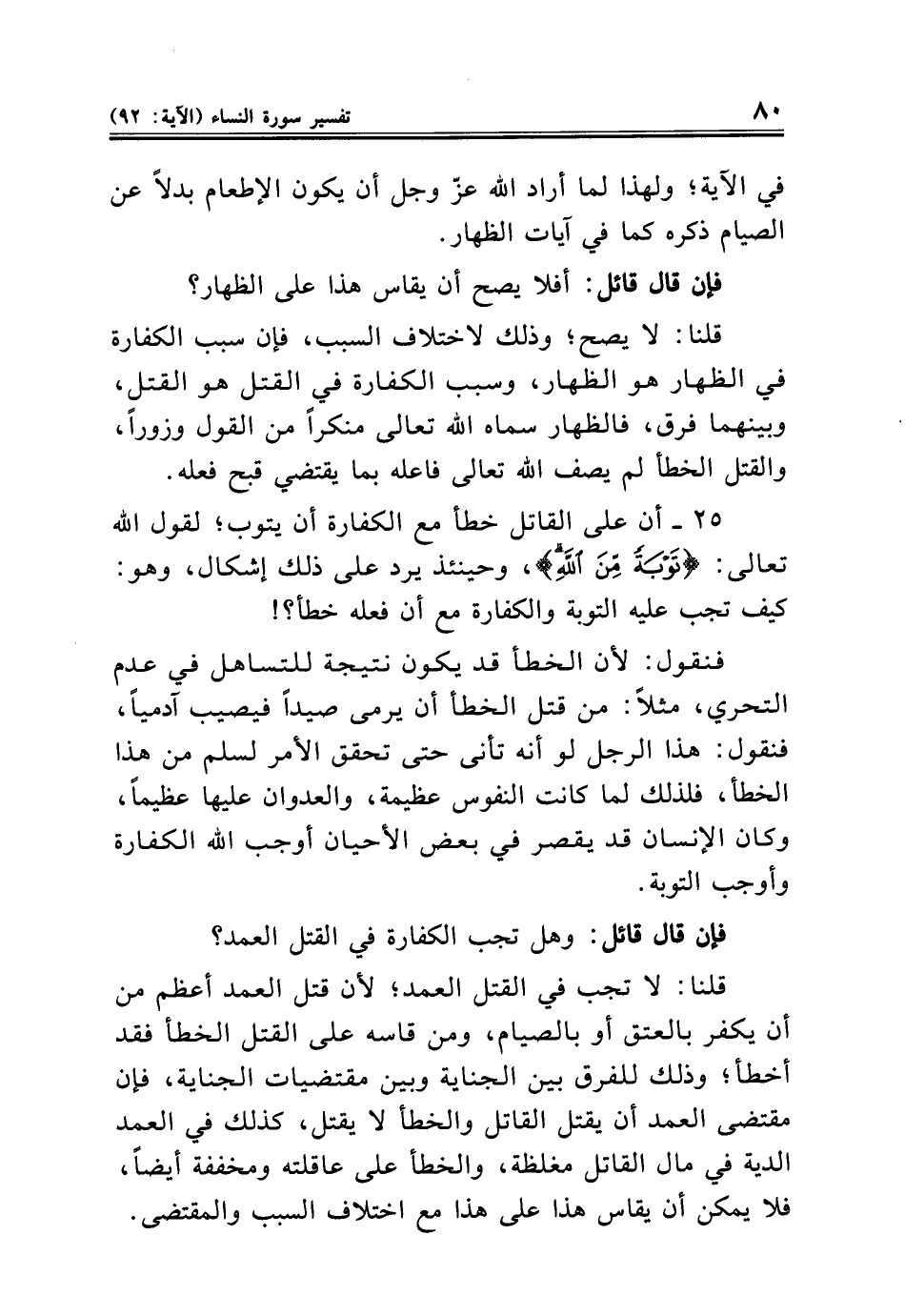 ٢٥ - أن على القاتل خطأ مع الكفارة أن يتوب؛ لقول الله تعالى: {تَوْبَةً مِنَ اللَّهِ}، وحينئذ يرد على ذلك إشكال، وهو: كيف تجب عليه التوبة والكفارة مع أن فعله خطأ؟ !