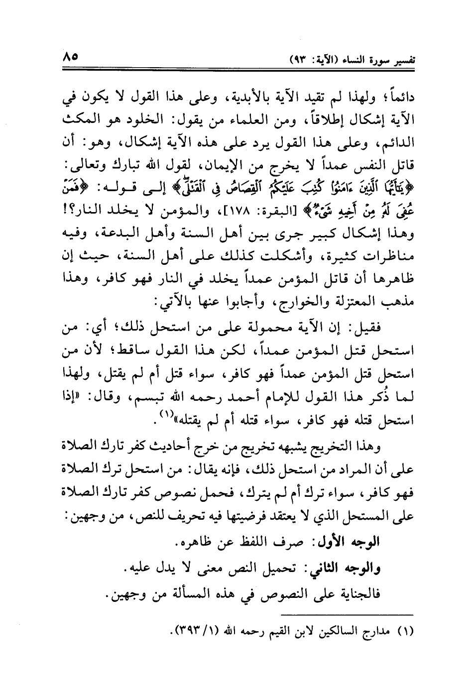 دائمًا؛ ولهذا لم تقيد الآية بالأبدية، وعلى هذا القول لا يكون في الآية إشكال إطلاقًا، ومن العلماء من يقول: الخلود هو المكث الدائم، وعلى هذا القول يرد على هذه الآية إشكال، وهو: أن قاتل النفس عمدًا لا يخرج من الإيمان، لقول الله تبارك وتعالى: {يَاأَيُّهَا الَّذِينَ آمَنُوا كُتِبَ عَلَيْكُمُ الْقِصَاصُ فِي الْقَتْلَى} إلى قوله: {فَمَنْ عُفِيَ لَهُ مِنْ أَخِيهِ شَيْءٌ} [البقرة: ١٧٨]، والمؤمن لا يخلد النار؟ ! وهذا إشكال كبير جرى بين أهل السنة وأهل البدعة، وفيه مناظرات كثيرة، وأشكلت كذلك على أهل السنة، حيث إن ظاهرها أن قاتل المؤمن عمدًا يخلد في النار فهو كافر، وهذا مذهب المعتزلة والخوارج، وأجابوا عنها بالآتي: