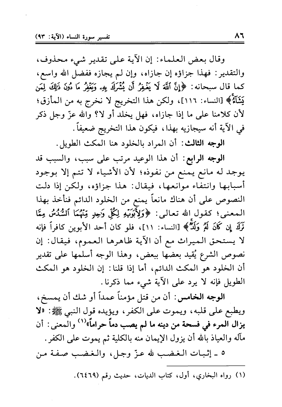 الوجه الرابع: أن هذا الوعيد مرتب على سبب، والسبب قد يوجد له مانع يمنع من نفوذه؛ لأن الأشياء لا تتم إلا بوجود أسبابها وانتفاء موانعها، فيقال: هذا جزاؤه، ولكن إذا دلت النصوص على أن هناك مانعًا يمنع من الخلود الدائم فنأخذ بهذا المعنى؛ كقول الله تعالى: {وَلِأَبَوَيْهِ لِكُلِّ وَاحِدٍ مِنْهُمَا السُّدُسُ مِمَّا تَرَكَ إِنْ كَانَ لَهُ وَلَدٌ} [النساء: ١١]، فلو كان أحد الأبوين كافرًا فإنه لا يستحق الميراث مع أن الآية ظاهرها العموم، فيقال: إن نصوص الشرع يُقيد بعضها ببعض، وهذا الوجه أسلمها على تقدير أن الخلود هو المكث الدائم، أما إذا قلنا: إن الخلود هو المكث الطويل فإنه لا يرد على الآية شيء مما ذكرنا.