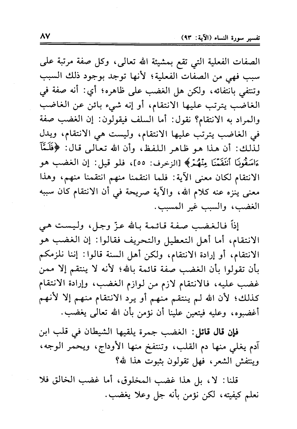 فإن قال قائل: الغضب جمرة يلقيها الشيطان في قلب ابن آدم يغلي منها دم القلب، وتنتفخ منها الأوداج، ويحمر الوجه، وينتفش الشعر، فهل تقولون بثبوت هذا لله؟