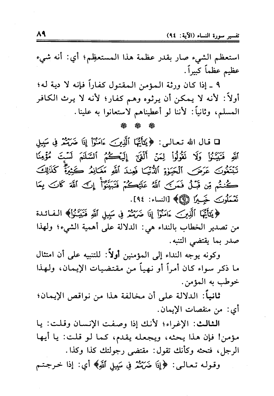 * قال الله تعالى: {يَاأَيُّهَا الَّذِينَ آمَنُوا إِذَا ضَرَبْتُمْ فِي سَبِيلِ اللَّهِ فَتَبَيَّنُوا وَلَا تَقُولُوا لِمَنْ أَلْقَى إِلَيْكُمُ السَّلَامَ لَسْتَ مُؤْمِنًا تَبْتَغُونَ عَرَضَ الْحَيَاةِ الدُّنْيَا فَعِنْدَ اللَّهِ مَغَانِمُ كَثِيرَةٌ كَذَلِكَ كُنْتُمْ مِنْ قَبْلُ فَمَنَّ اللَّهُ عَلَيْكُمْ فَتَبَيَّنُوا إِنَّ اللَّهَ كَانَ بِمَا تَعْمَلُونَ خَبِيرًا (٩٤)} [النساء: ٩٤].