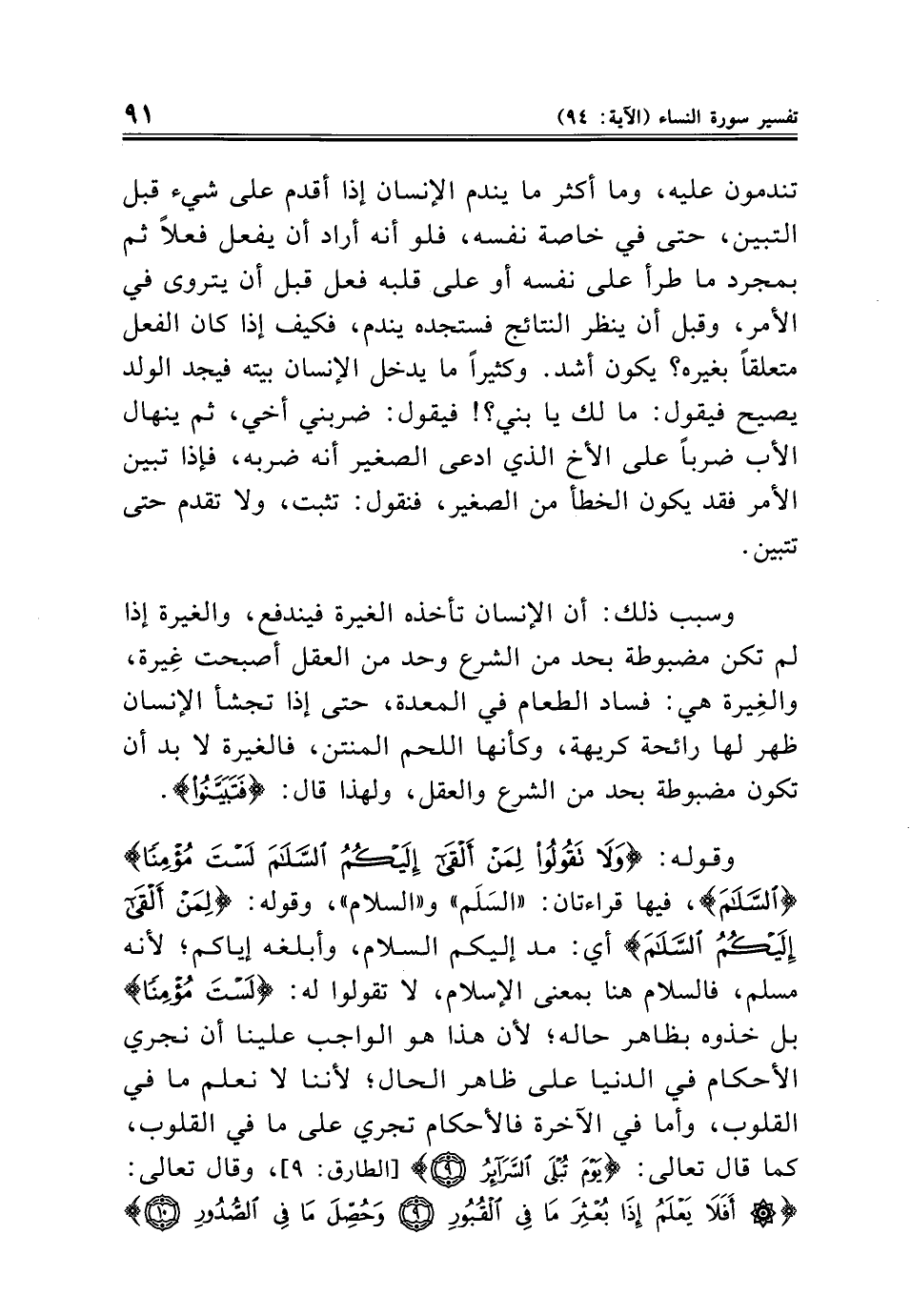 وقوله: {وَلَا تَقُولُوا لِمَنْ أَلْقَى إِلَيْكُمُ السَّلَامَ لَسْتَ مُؤْمِنًا} {السَّلَامَ}، فيها قراءتان: "السَلَم" و"السلام"، وقوله: {لِمَنْ أَلْقَى إِلَيْكُمُ السَّلَامَ} أي: مد إليكم السلام، وأبلغه إياكم؛ لأنه مسلم، فالسلام هنا بمعنى الإسلام، لا تقولوا له: {لَسْتَ مُؤْمِنًا} بل خذوه بظاهر حاله؛ لأن هذا هو الواجب علينا أن نجري الأحكام في الدنيا على ظاهر الحال؛ لأننا لا نعلم ما في القلوب، وأما في الآخرة فالأحكام تجري على ما في القلوب، كما قال تعالى: {يَوْمَ تُبْلَى السَّرَائِرُ (٩)} [الطارق: ٩]، وقال تعالى: {أَفَلَا يَعْلَمُ إِذَا بُعْثِرَ مَا فِي الْقُبُورِ (٩) وَحُصِّلَ مَا فِي الصُّدُورِ (١٠)}