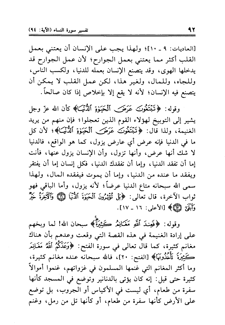 وقوله: {تَبْتَغُونَ عَرَضَ الْحَيَاةِ الدُّنْيَا} كأن الله عزّ وجل يشير إلى التوبيخ لهؤلاء القوم الذين تعجلوا؛ فإن منهم من يريد الغنيمة، ولذا قال: {تَبْتَغُونَ عَرَضَ الْحَيَاةِ الدُّنْيَا}؛ لأن كل ما في الدنيا فإنه عرض أي عارض يزول، كما هو الواقع، فالدنيا لا شك أنها عرض، وأنها تزول، وأن الإنسان يزول عنها، فأنت إما أن تفقد الدنيا، وإما أن تفقدك الدنيا، فكل إنسان إما أن يفتقر ويفقد ما عنده من الدنيا، وإما أن يموت فيفقده المال، ولهذا سمى الله سبحانه متاع الدنيا عرضًا؛ لأنه يزول، وأما الباقي فهو ثواب الآخرة، قال تعالى: {بَلْ تُؤْثِرُونَ الْحَيَاةَ الدُّنْيَا (١٦) وَالْآخِرَةُ خَيْرٌ وَأَبْقَى (١٧)} [الأعلى: ١٦ - ١٧].