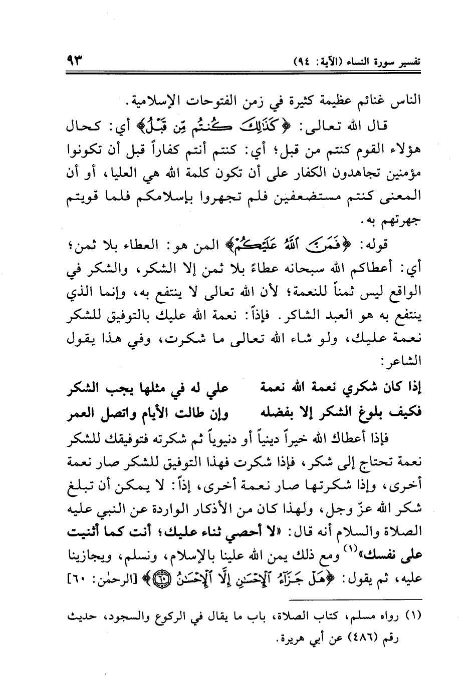 فإذا أعطاك الله خيرًا دينيًا أو دنيويًا ثم شكرته فتوفيقك للشكر نعمة تحتاج إلى شكر، فإذا شكرت فهذا التوفيق للشكر صار نعمة أخرى، وإذا شكرتها صار نعمة أخرى، إذًا: لا يمكن أن تبلغ شكر الله عزّ وجل، ولهذا كان من الأذكار الواردة عن النبي عليه الصلاة والسلام أنه قال: "لا أحصي ثناء عليك؛ أنت كما أثنيت على نفسك" (¬١) ومع ذلك يمن الله علينا بالإسلام، ونسلم، ويجازينا عليه، ثم يقول: {هَلْ جَزَاءُ الْإِحْسَانِ إِلَّا الْإِحْسَانُ (٦٠)} [الرحمن: ٦٠]