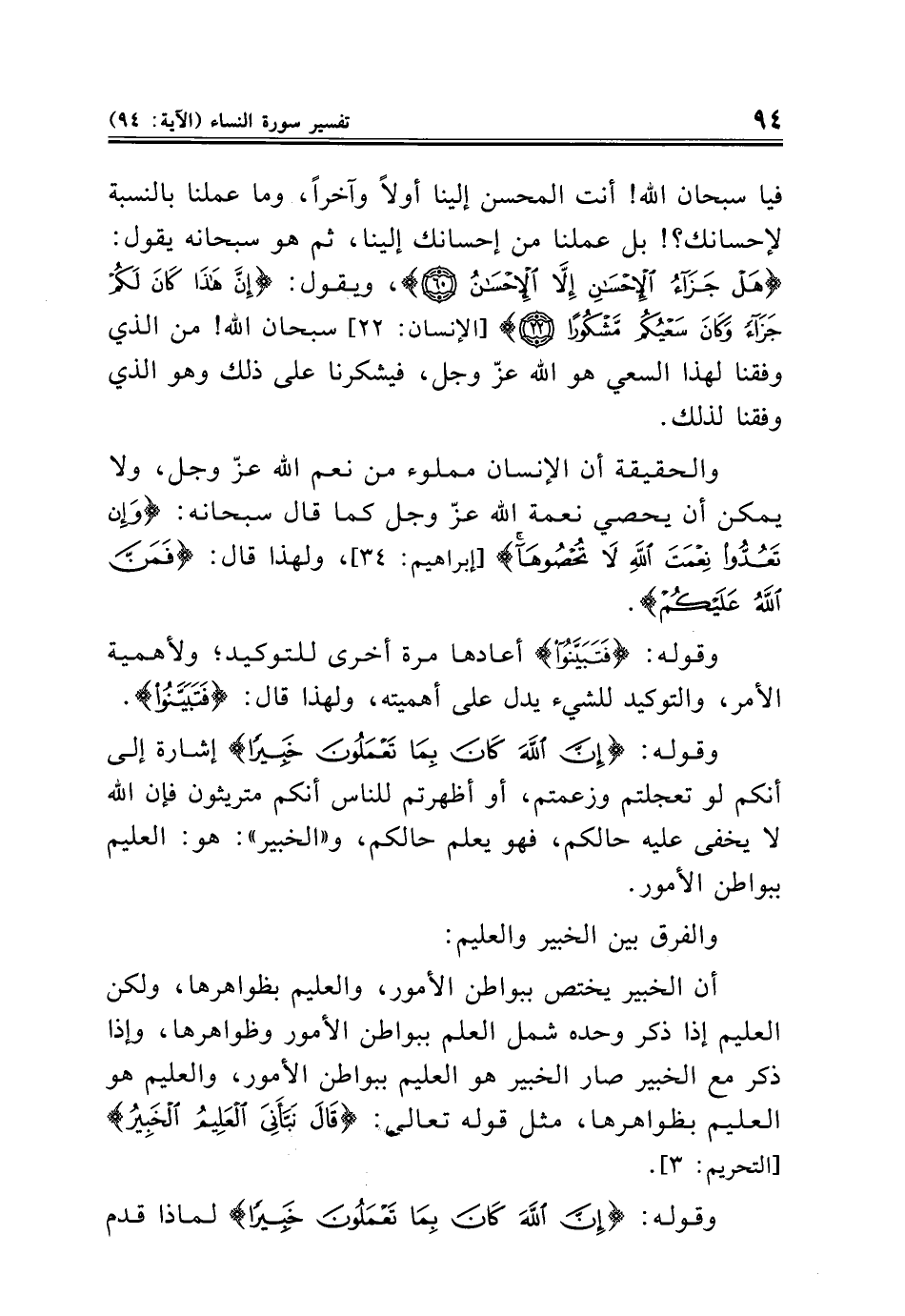 أن الخبير يختص ببواطن الأمور، والعليم بظواهرها، ولكن العليم إذا ذكر وحده شمل العلم ببواطن الأمور وظواهرها، وإذا ذكر مع الخبير صار الخبير هو العليم ببواطن الأمور، والعليم هو العليم بظواهرها، مثل قوله تعالى: {قَالَ نَبَّأَنِيَ الْعَلِيمُ الْخَبِيرُ} [التحريم: ٣].