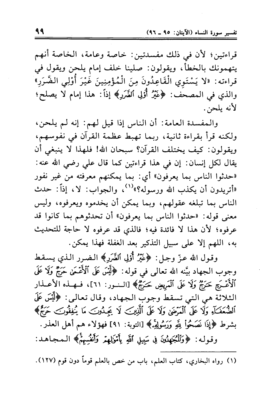 والمفسدة العامة: أن الناس إذا قيل لهم: إنه لم يلحن، ولكنه قرأ بقراءة ثانية، ربما تهبط عظمة القرآن في نفوسهم، ويقولون: كيف يختلف القرآن؟ سبحان الله! فلهذا لا ينبغي أن يقال لكل إنسان: إن في هذا قراءتين كما قال علي - رضي الله عنه -: "حدثوا الناس بما يعرفون" أي: بما يمكنهم معرفته من غير نفور "أتريدون أن يكذب الله ورسوله؟ " (¬١)، والجواب: لا، إذًا: حدث الناس بما تبلغه عقولهم، وبما يمكن أن يخدموه ويعرفوه، وليس معنى قوله: "حدثوا الناس بما يعرفون" أن تحدثوهم بما كانوا قد عرفوه؛ لأن هذا لا فائدة فيه؛ فالذي قد عرفوه لا حاجة للتحديث به، اللهم إلا على سبيل التذكير بعد الغفلة فهذا يمكن.