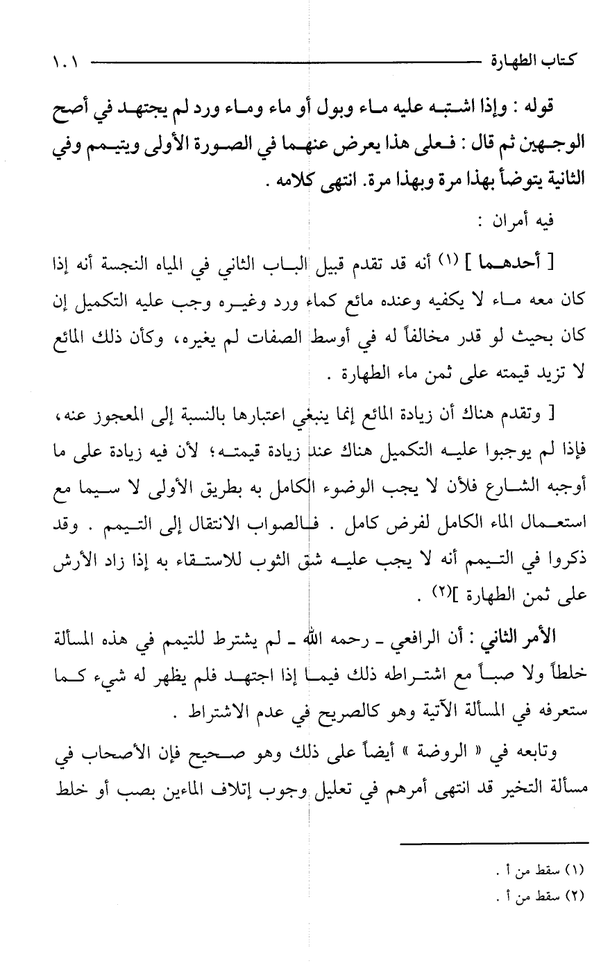 قوله: وإذا اشتبه عليه ماء وبول أو ماء وماء ورد لم يجتهد في أصح الوجهين ثم قال: فعلى هذا يعرض عنهما في الصورة الأولى ويتيمم وفي الثانية يتوضأ بهذا مرة وبهذا مرة. انتهى كلامه.