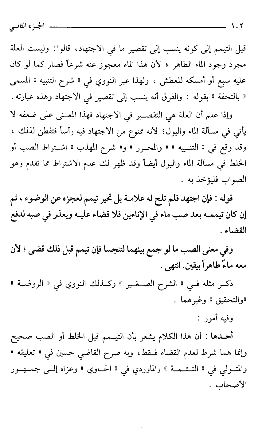 وإذا علم أن العلة هي التقصير في الاجتهاد فهذا المعنى على ضعفه لا يأتي في مسألة الماء والبول؛ لأنه ممنوع من الاجتهاد فيه رأسًا فتفطن لذلك، وقد وقع في "التنبيه" "والمحرر" و"شرح المهذب" اشتراط الصب أو الخلط في مسألة الماء والبول أيضًا وقد ظهر لك عدم الاشتراط مما تقدم وهو الصواب فليؤخذ به.