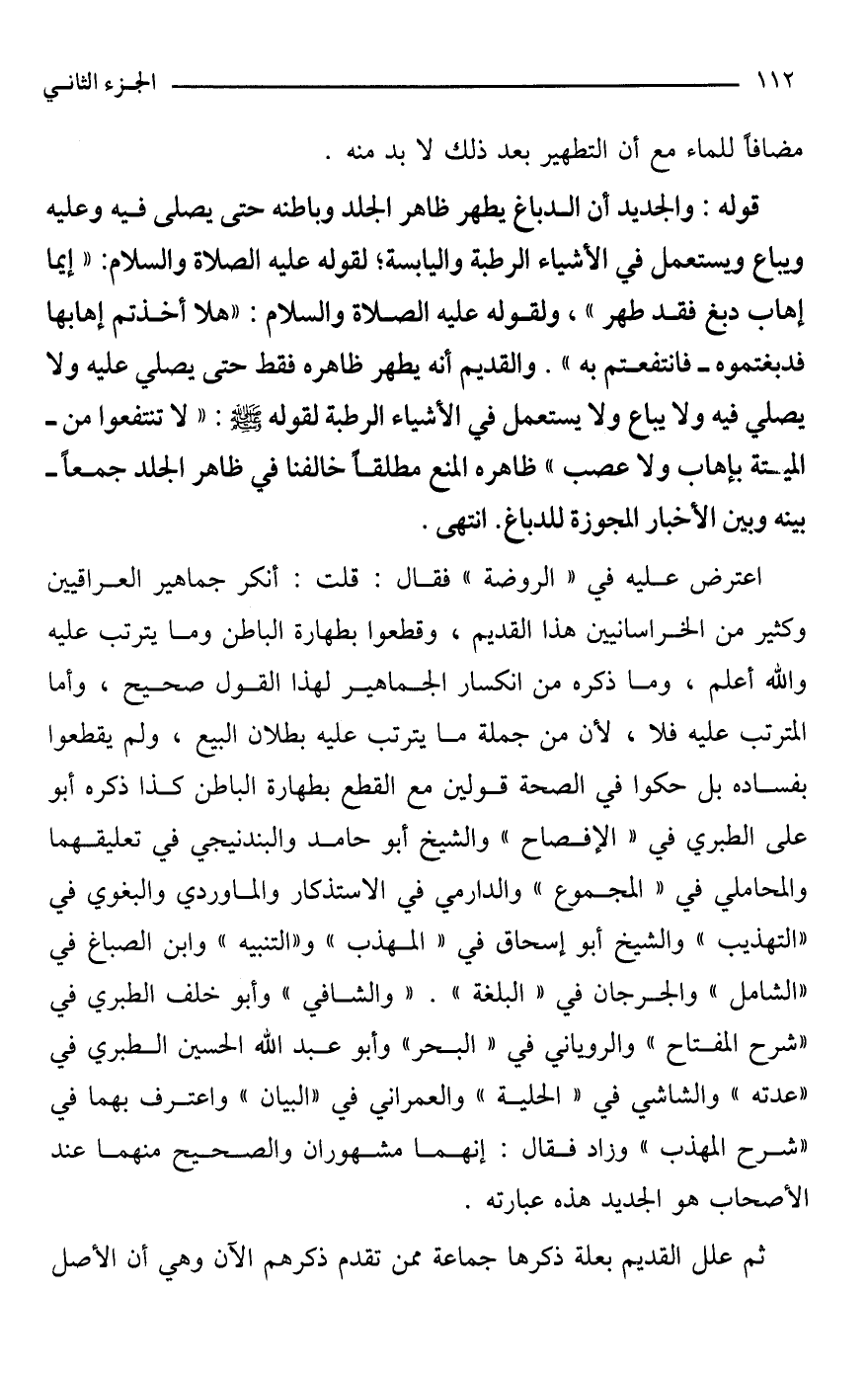 قوله: والجديد أن الدباغ يطهر ظاهر الجلد وباطنه حتى يصلى فيه وعليه ويباع ويستعمل في الأشياء الرطبة واليابسة؛ لقوله -عليه الصلاة والسلام-: "إيما إهاب دبغ فقد طهر"، ولقوله -عليه الصلاة والسلام-: "هلا أخذتم إهابها فدبغتموه- فانتفعتم به". والقديم أنه يطهر ظاهره فقط حتى يصلي عليه ولا يصلي فيه ولا يباع ولا يستعمل في الأشياء الرطبة لقوله - صَلَّى اللَّهُ عَلَيْهِ وَسَلَّمَ -: "لا تنتفعوا من -الميتة بإهاب ولا عصب" ظاهره المنع مطلقًا خالفنا في ظاهر الجلد جمعًا- بينه وبين الأخبار المجوزة للدباغ. انتهى.