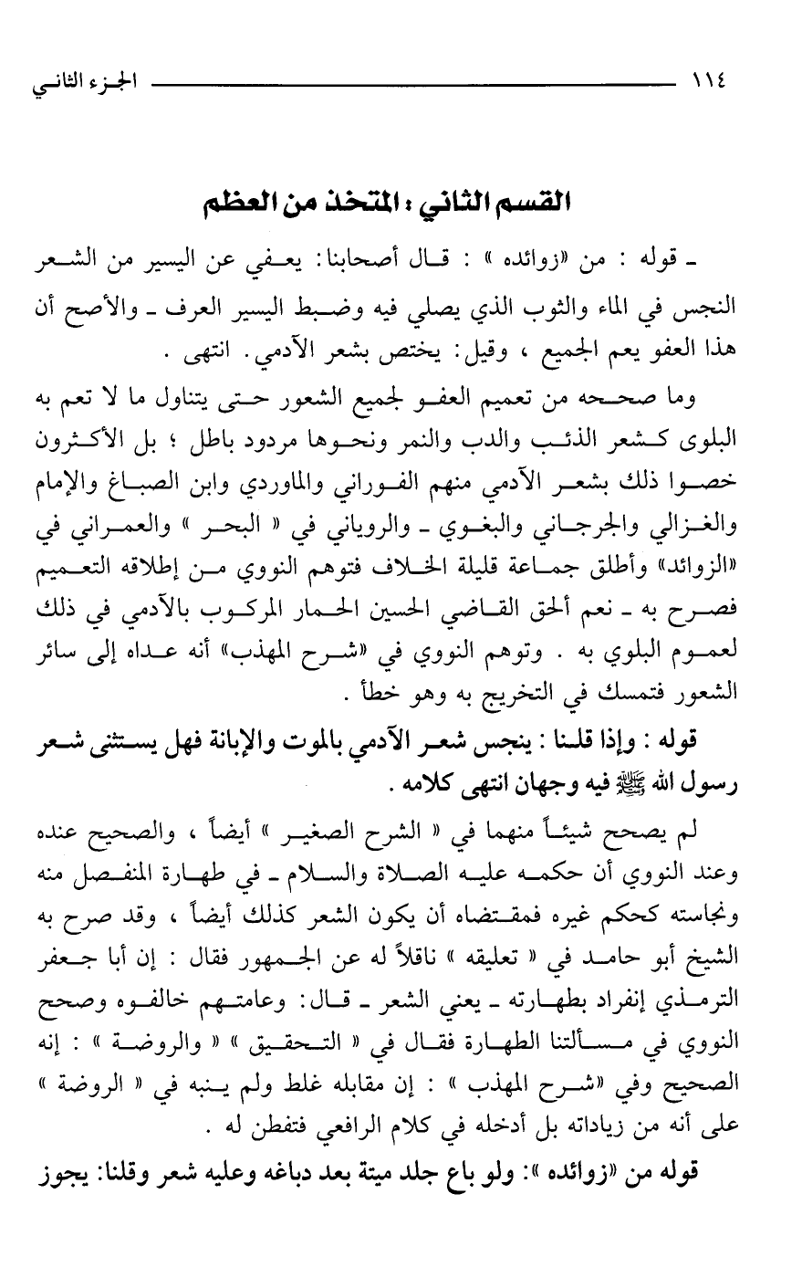 - قوله: من "زوائده": قال أصحابنا: يعفي عن اليسير من الشعر النجس في الماء والثوب الذي يصلي فيه وضبط اليسير العرف -والأصح أن هذا العفو يعم الجميع، وقيل: يختص بشعر الآدمي. انتهى.