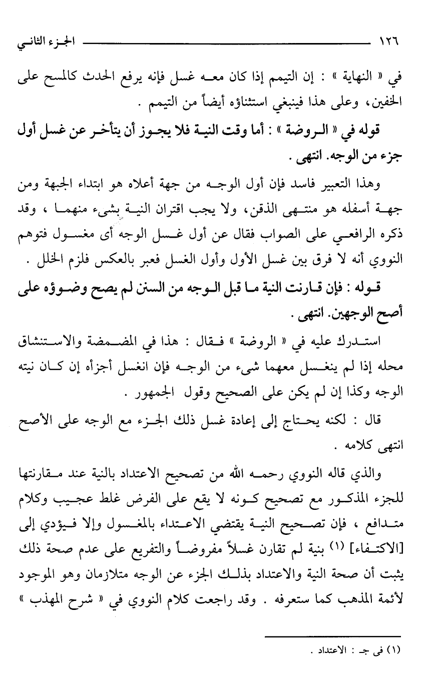 وهذا التعبير فاسد فإن أول الوجه من جهة أعلاه هو ابتداء الجبهة ومن جهة أسفله هو منتهى الذقن، ولا يجب اقتران النية بشئ منهما، وقد ذكره الرافعي على الصواب فقال عن أول غسل الوجه أى مغسول فتوهم النووي أنه لا فرق بين غسل الأول وأول الغسل فعبر بالعكس فلزم الخلل.