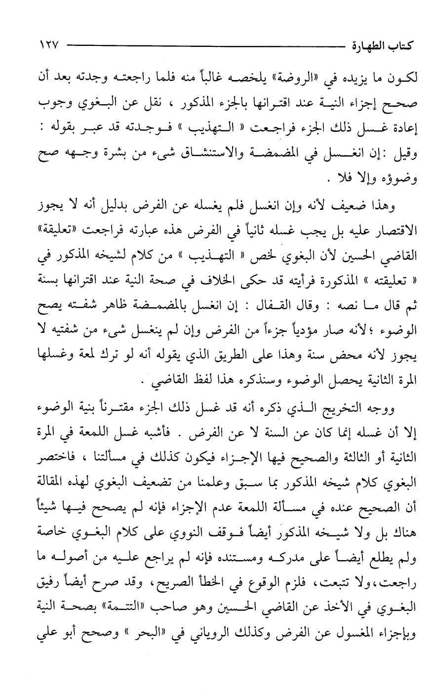 لكون ما يزيده في "الروضة" يلخصه غالبًا منه فلما راجعته وجدته بعد أن صحح إجزاء النية عند اقترانها بالجزء المذكور، نقل عن البغوي وجوب إعادة غسل ذلك الجزء فراجعت "التهذيب" فوجدته قد عبر بقوله: وقيل: إن انغسل في المضمضة والاستنشاق شئ من بشرة وجهه صح وضوؤه وإلا فلا.