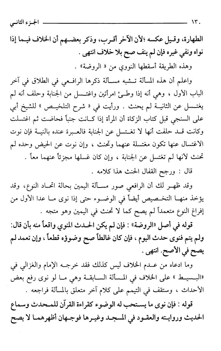 وقد ظهر لك أن الرافعي صور مسألة اليمين بحالة اتحاد النوع، وقد يؤخذ منها التخصيص أيضًا في الوضوء حتى إذا نوى ما عدا الأول من إفراغ النوع متعمدًا لم يصح كما لا تحنث في اليمين وهو متجه.