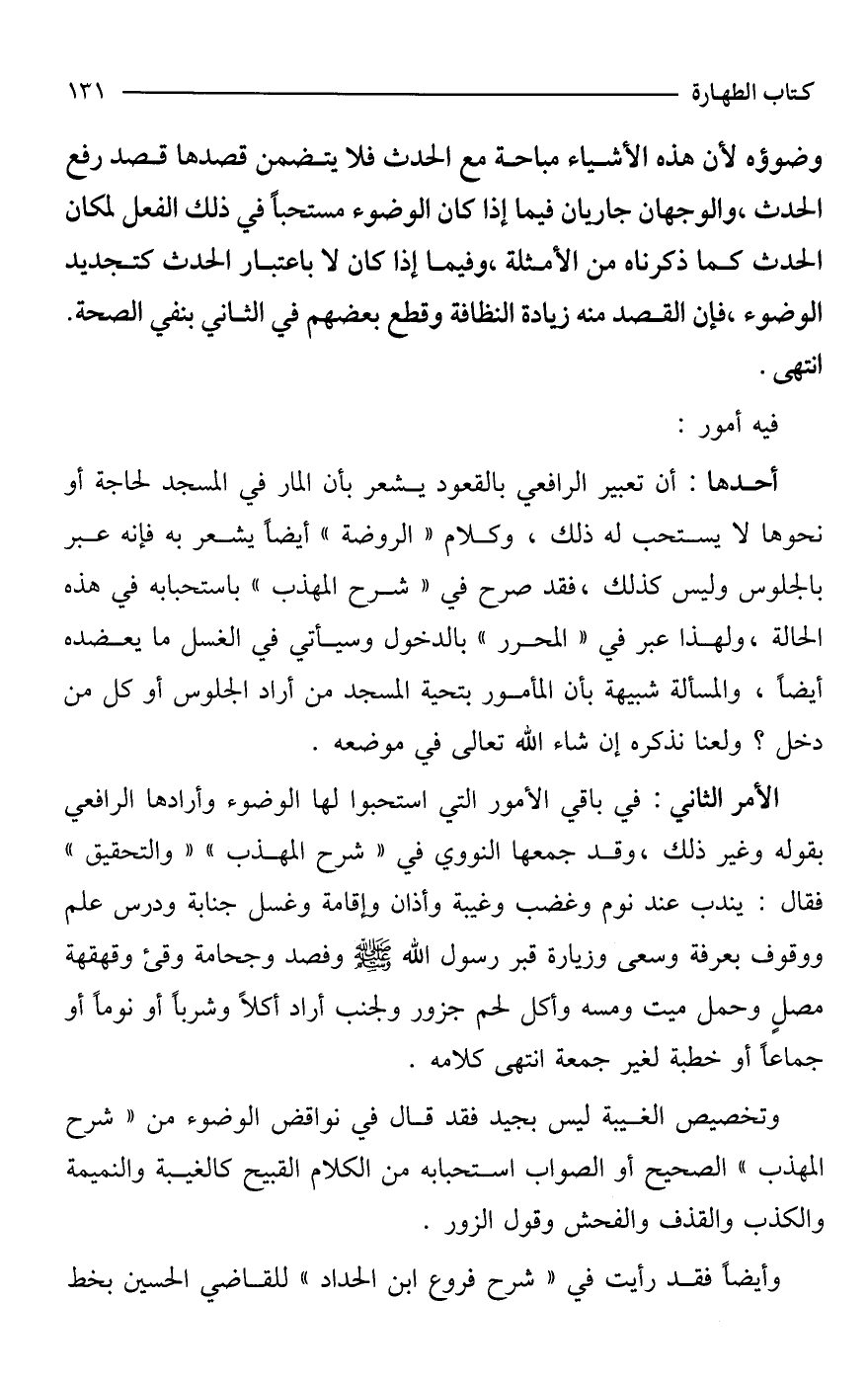 الأمر الثاني: في باقي الأمور التي استحبوا لها الوضوء وأرادها الرافعي بقوله وغير ذلك، وقد جمعها النووي في "شرح المهذب" "والتحقيق" فقال: يندب عند نوم وغضب وغيبة وأذان وإقامة وغسل جنابة ودرس علم ووقوف بعرفة وسعى وزيارة قبر رسول الله - صَلَّى اللَّهُ عَلَيْهِ وَسَلَّمَ - وفصد وحجامة وقئ وقهقهة مصلٍ وحمل ميت ومسه وأكل لحم جزور ولجنب أراد أكلًا وشربًا أو نومًا أو جماعًا أو خطبة لغير جمعة انتهى كلامه.