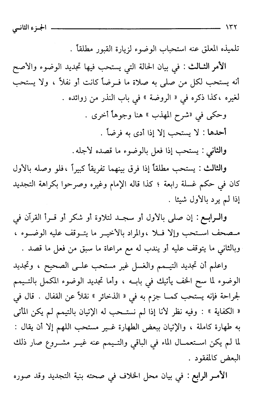 والرابع: إن صلى بالأول أو سجد لتلاوة أو شكر أو قرأ القرآن في مصحف استحب وإلا فلا، والمراد بالأخير ما يتوقف عليه الوضوء، وبالثاني ما يتوقف عليه أو يندب له مع مراعاة ما سبق من فعل ما قصد.