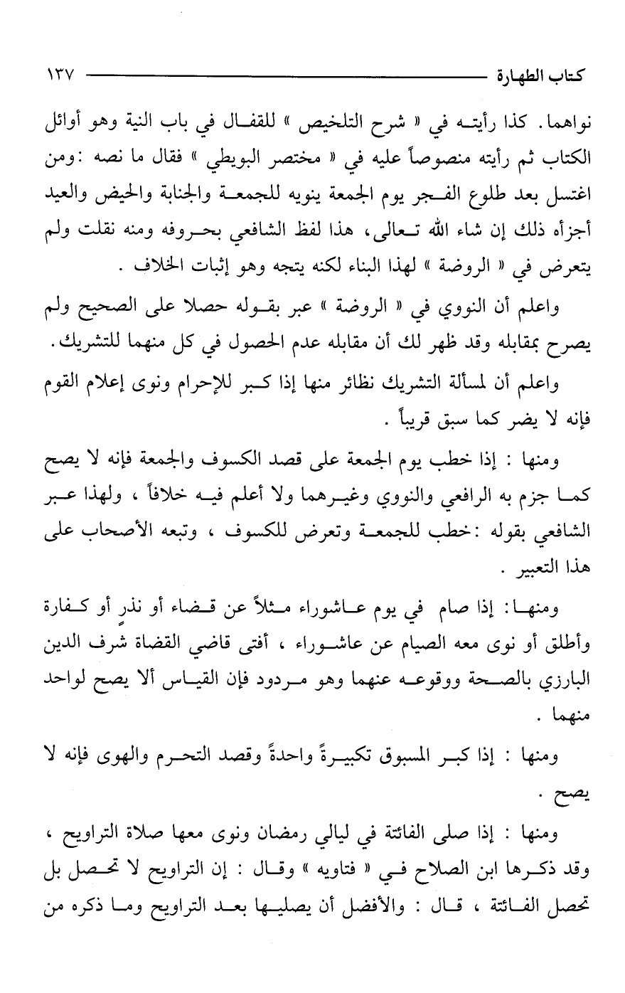 ومنها: إذا صام في يوم عاشوراء مثلًا عن قضاء أو نذرٍ أو كفارة وأطلق أو نوى معه الصيام عن عاشوراء، أفتى قاضي القضاة شرف الدين البارزي بالصحة ووقوعه عنهما وهو مردود فإن القياس ألا يصح لواحد منهما.