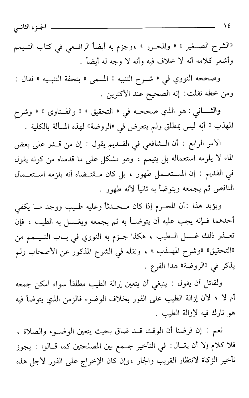 ويؤيد هذا: أن المحرم إذا كان محدثًا وعليه طيب ووجد ما يكفي أحدهما فإنه يجب عليه أن يتوضأ به ثم يجمعه ويغسل به الطيب، فإن تعذر ذلك غسل الطيب، هكذا جزم به النووي في باب التيمم من "التحقيق" "وشرح المهذب"، ونقله في الشرح المذكور عن الأصحاب ولم يذكر في "الروضة" هذا الفرع.