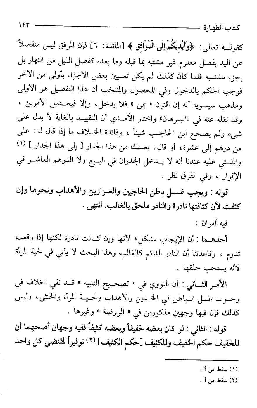 قوله: ويجب غسل باطن الحاجبين والعزارين والأهداب ونحوها وإن كثفت لأن كثافتها نادرة والنادر ملحق بالغالب. انتهى.
