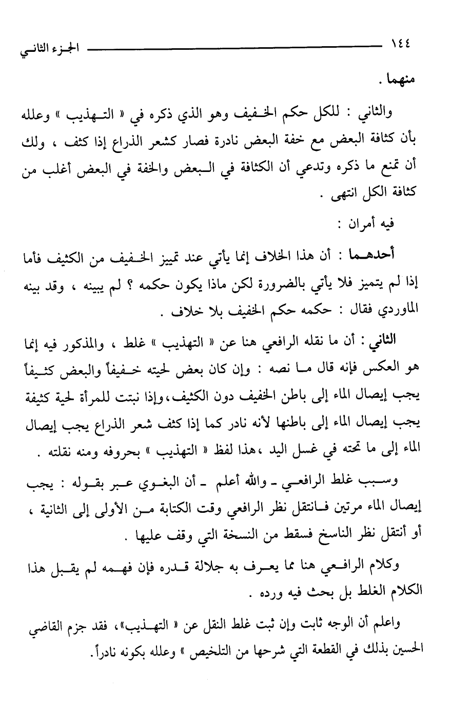 الثاني: أن ما نقله الرافعي هنا عن "التهذيب" غلط، والمذكور فيه إنما هو العكس فإنه قال ما نصه: كان كان بعض لحيته خفيفًا والبعض كثيفًا يجب إيصال الماء إلى باطن الخفيف دون الكثيف، وإذا نبتت للمرأة لحية كثيفة يجب إيصال الماء إلى باطنها لأنه نادر كما إذا كثف شعر الذراع يجب إيصال الماء إلى ما تحته في غسل اليد، هذا لفظ "التهذيب" بحروفه ومنه نقلته.