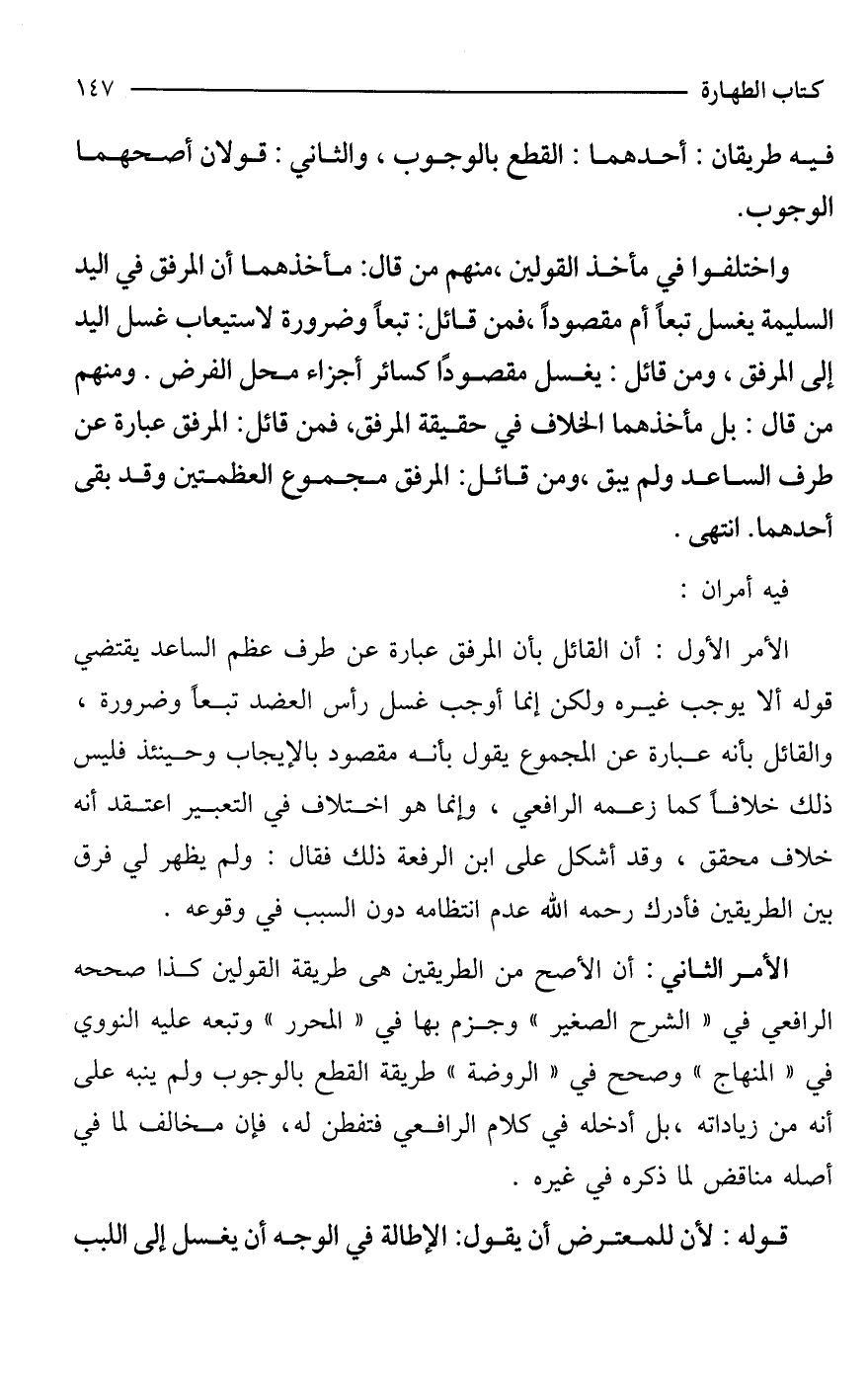الأمر الأول: أن القائل بأن المرفق عبارة عن طرف عظم الساعد يقتضي قوله ألا يوجب غيره ولكن إنما أوجب غسل رأس العضد تبعًا وضرورة، والقائل بأنه عبارة عن المجموع يقول بأنه مقصود بالإيجاب وحينئذ فليس ذلك خلافًا كما زعمه الرافعي، وإنما هو اختلاف في التعبير اعتقد أنه خلاف محقق، وقد أشكل على ابن الرفعة ذلك فقال: ولم يظهر لي فرق بين الطريقين فأدرك -رحمه الله- عدم انتظامه دون السبب في وقوعه.