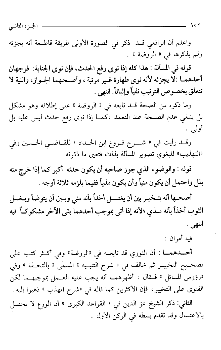 قوله في المسألة: هذا كله إذا نوى رفع الحدث، فإن نوى الجنابة: فوجهان أحدهما: لا يجزئه لأنه نوى طهارة غير مرتبة، وأصحهما الجواز، والنية لا تتعلق بخصوص الترتيب نفيًا وإثباتًا. انتهى.