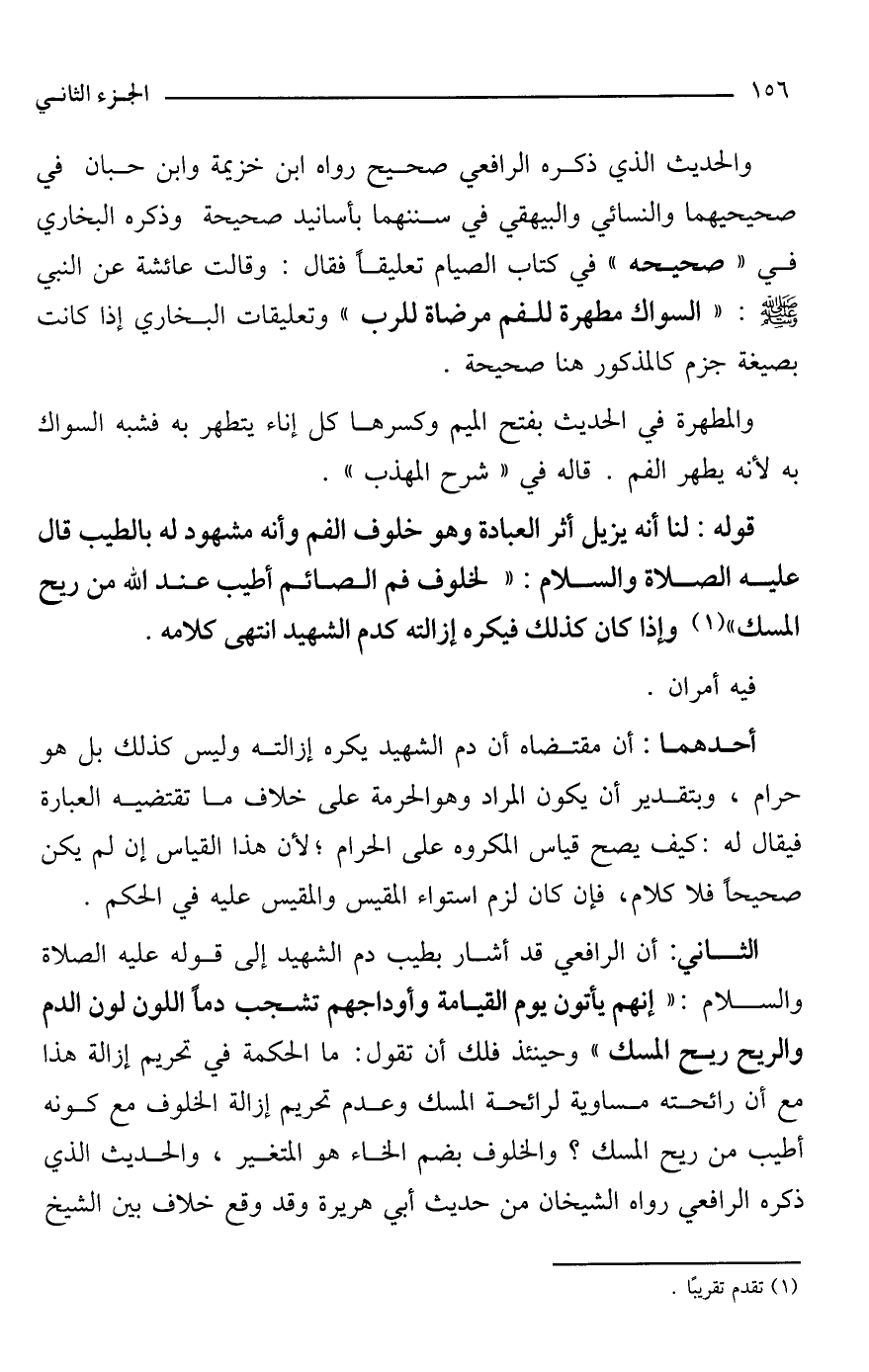 الثاني: أن الرافعي قد أشار بطيب دم الشهيد إلى قوله -عليه الصلاة والسلام-: "إنهم يأتون يوم القيامة وأوداجهم تشجب دمًا اللون لون الدم والريح ريح المسك" وحينئذ فلك أن تقول: ما الحكمة في تحريم إزالة هذا مع أن رائحته مساوية لرائحة المسك وعدم تحريم إزالة الخلوف مع كونه أطيب من ريح المسك؟ والخلوف بضم الخاء هو المتغير، والحديث الذي ذكره الرافعي رواه الشيخان من حديث أبي هريرة وقد وقع خلاف بين الشيخ