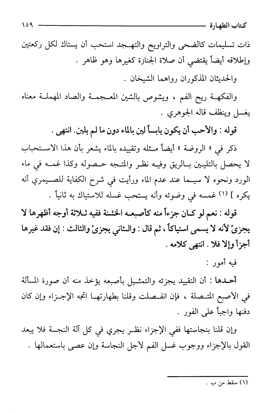 قوله: نعم لو كان جزءًا منه كأصبعه الخشنة ففيه ثلاثة أوجه أظهرها لا يجزئ لأنه لا يسمى استياكًا، ثم قال: والثاني يجزئ والثالث: إن فقد غيرها أجزأ وإلا فلا. انتهى كلامه.