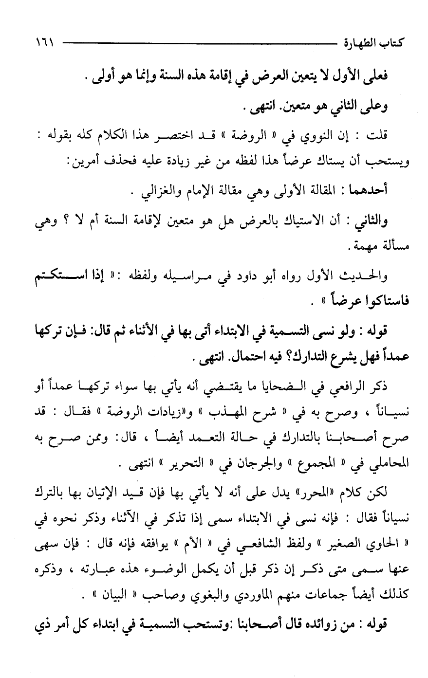 لكن كلام "المحرر" يدل على أنه لا يأتي بها فإن قيد الإتيان بها بالترك نسيانًا فقال: فإنه نسى في الابتداء سمى إذا تذكر في الأثناء وذكر نحوه في "الحاوي الصغير" ولفظ الشافعي في "الأم" يوافقه فإنه قال: فإن سهى عنها سمى متى ذكر إن ذكر قبل أن يكمل الوضوء هذه عبارته، وذكره كذلك أيضًا جماعات منهم الماوردي والبغوي وصاحب "البيان".