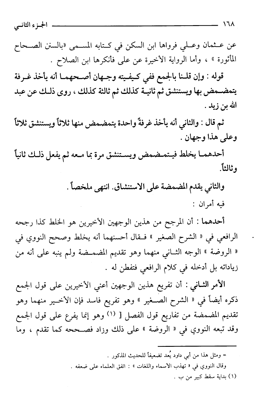 الأمر الثاني: أن تفريع هذين الوجهين أعني الأخيرين على قول الجمع ذكره أيضًا في "الشرح الصغير" وهو تفريع فاسد فإن الأخير منهما وهو تقديم المضمضة من تفاريع قول الفصل [(¬1) وهو إنما يفرع على قول الجمع وقد تبعه النووي في "الروضة" على ذلك وزاد فصححه كما تقدم، وما