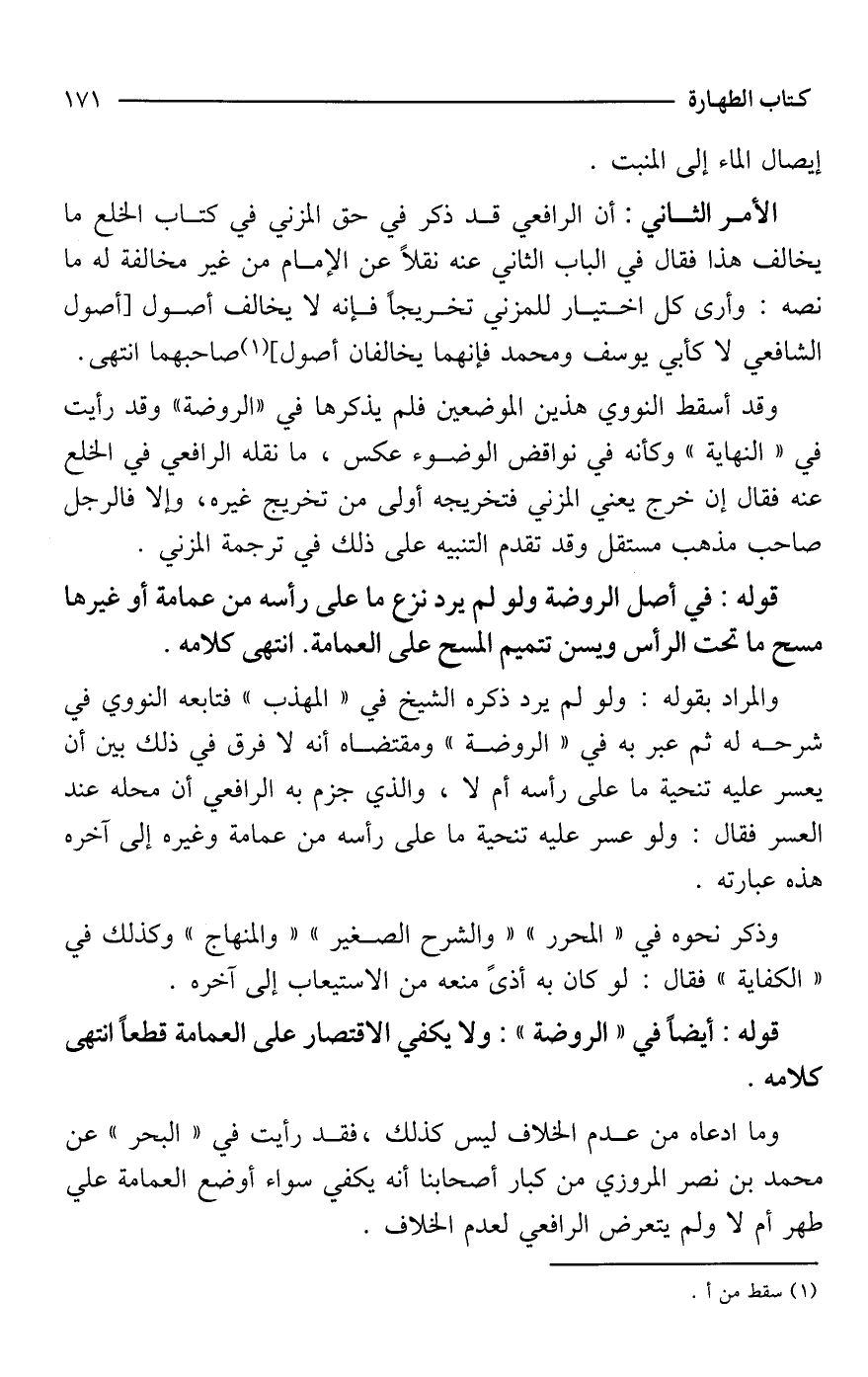 وما ادعاه من عدم الخلاف ليس كذلك، فقد رأيت في "البحر" عن محمد بن نصر المروزي من كبار أصحابنا أنه يكفي سواء أوضع العمامة علي طهر أم لا ولم يتعرض الرافعي لعدم الخلاف.