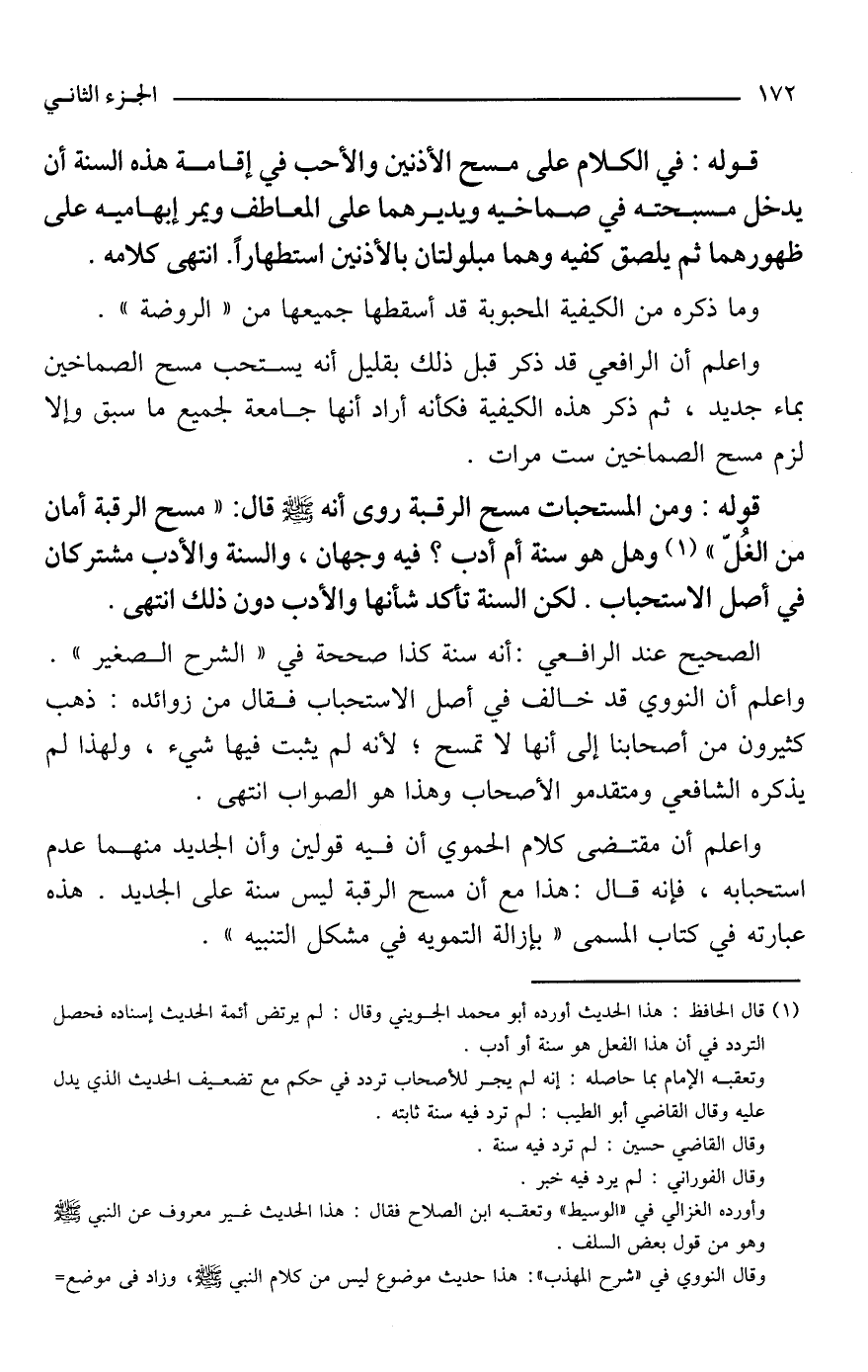 واعلم أن مقتضى كلام الحموي أن فيه قولين وأن الجديد منهما عدم استحبابه، فإنه قال: هذا مع أن مسح الرقبة ليس سنة على الجديد. هذه عبارته في كتاب المسمى "بإزالة التمويه في مشكل التنبيه".