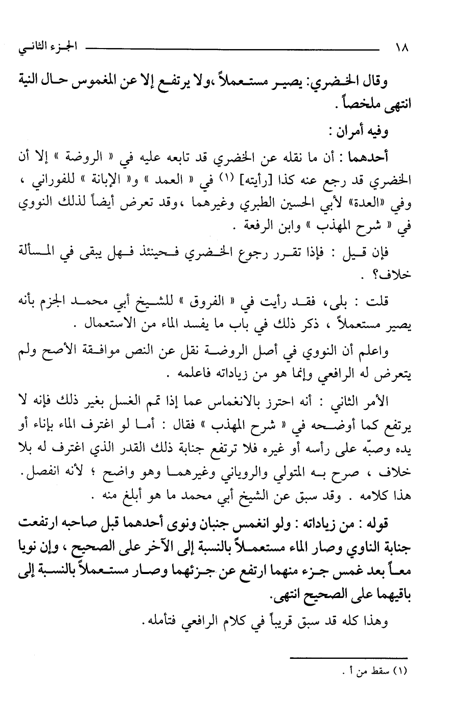 أحدهما: أن ما نقله عن الخضري قد تابعه عليه في "الروضة" إلا أن الخضري قد رجع عنه كذا [رأيته] (¬1) في "العمد" و"الإبانة" للفوراني، وفي "العدة" لأبي الحسين الطبري وغيرهما، وقد تعرض أيضًا لذلك النووي في "شرح المهذب" وابن الرفعة.