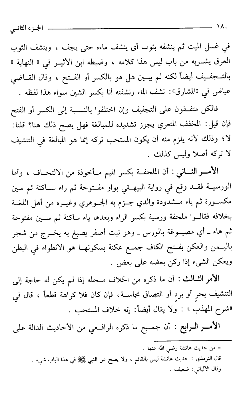 فالكل متفقون على التجفيف وإن اختلفوا بالنسبة إلى الكسر أو الفتح فإن قيل: المخفف المتعري يجوز تشديده للمبالغة فهل يصح ذلك هنا؟ قلنا: لا؛ وذلك لأنه يلزم منه أن يكون المستحب تركه إنما هو المبالغة في التنشيف لا تركه أصلا وليس كذلك.
