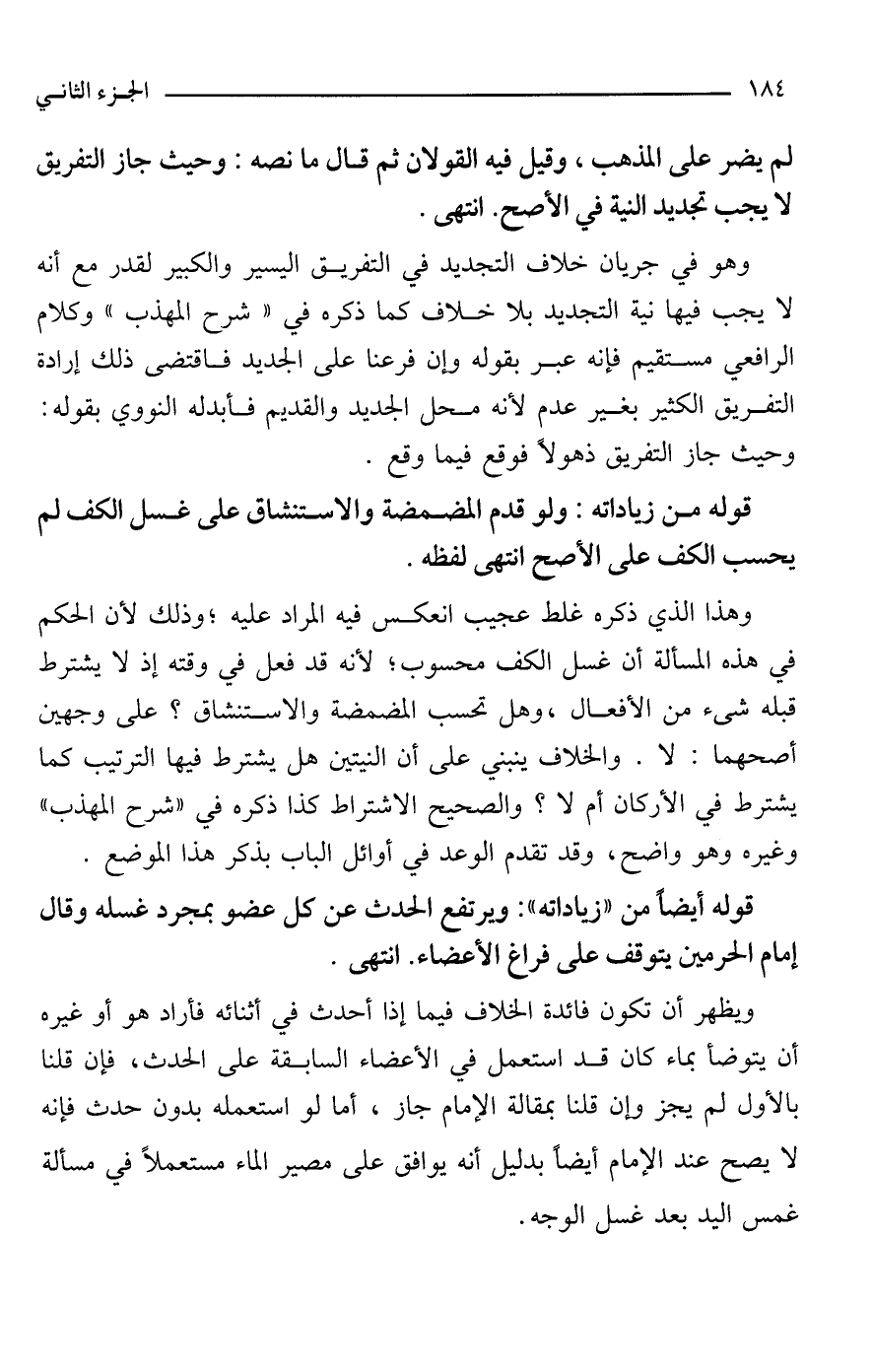قوله أيضًا من "زياداته": ويرتفع الحدث عن كل عضو بمجرد غسله وقال إمام الحرمين يتوقف على فراغ الأعضاء. انتهى.