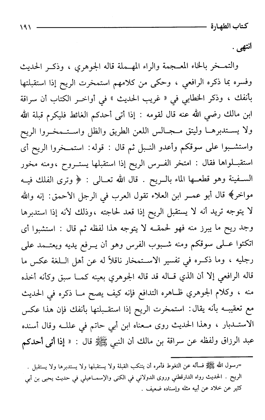 والتمخر بالخاء المعجمة والراء المهملة قاله الجوهري، وذكر الحديث وفسره بما ذكره الرافعي، وحكى من كلامهم استمخرت الريح إذا استقبلتها بأنفك، وذكر الخطابي في "غريب الحديث" في أواخر الكتاب أن سراقة ابن مالك - رضي الله عنه - قال لقومه: إذا أتى أحدكم الغائط فليكرم قبلة الله ولا يستدبرها وليتق مجالس اللعن الطريق والظل واستمخروا الريح واستشبوا على سوقكم وأعدو النبل ثم قال: قوله: استمخروا الريح أى استقبلوها فقال: امتخر الفرس الريح إذا استقبلها يستروح، ومنه مخور السفينة وهو قطعها الماء بالريح. قال الله تعالى: {وَتَرَى الْفُلْكَ فِيهِ مَوَاخِرَ} قال أبو عمر ابن العلاء تقول العرب في الرجل الأَحمق: إنه والله لا يتوجه تريد أنه لا يستقبل الريح إذا قعد لحاجته، وذلك لأنه إذا استدبرها وجد ريح ما يبرز منه فهو لحمقه لا يتوجه هذا لفظه ثم قال: استشبوا أى اتكئوا على سوقكم ومنه شبوب الفرس وهو أن يرفع يديه ويعتمد على رجليه، وما ذكره في تفسير الاستمخار ناقلًا له عن أهل اللغة عكس ما قاله الرافعي إلا أن الذي قاله قد قاله الجوهري بعينه كما سبق وكأنه أخذه منه، وكلام الجوهري ظاهره التدافع فإنه كيف يصح ما ذكره في الحديث مع تعقيبه بأنه يقال: استمخرت الريح إذا استقبلتها بأنفك فإن هذا عكس الاستدبار، وهذا الحديث روى معناه ابن أبي حاتم في علله وقال أسنده عبد الرزاق ولفظه عن سراقة بن مالك أن النبي - صَلَّى اللَّهُ عَلَيْهِ وَسَلَّمَ - قال: "إذا أتى أحدكم