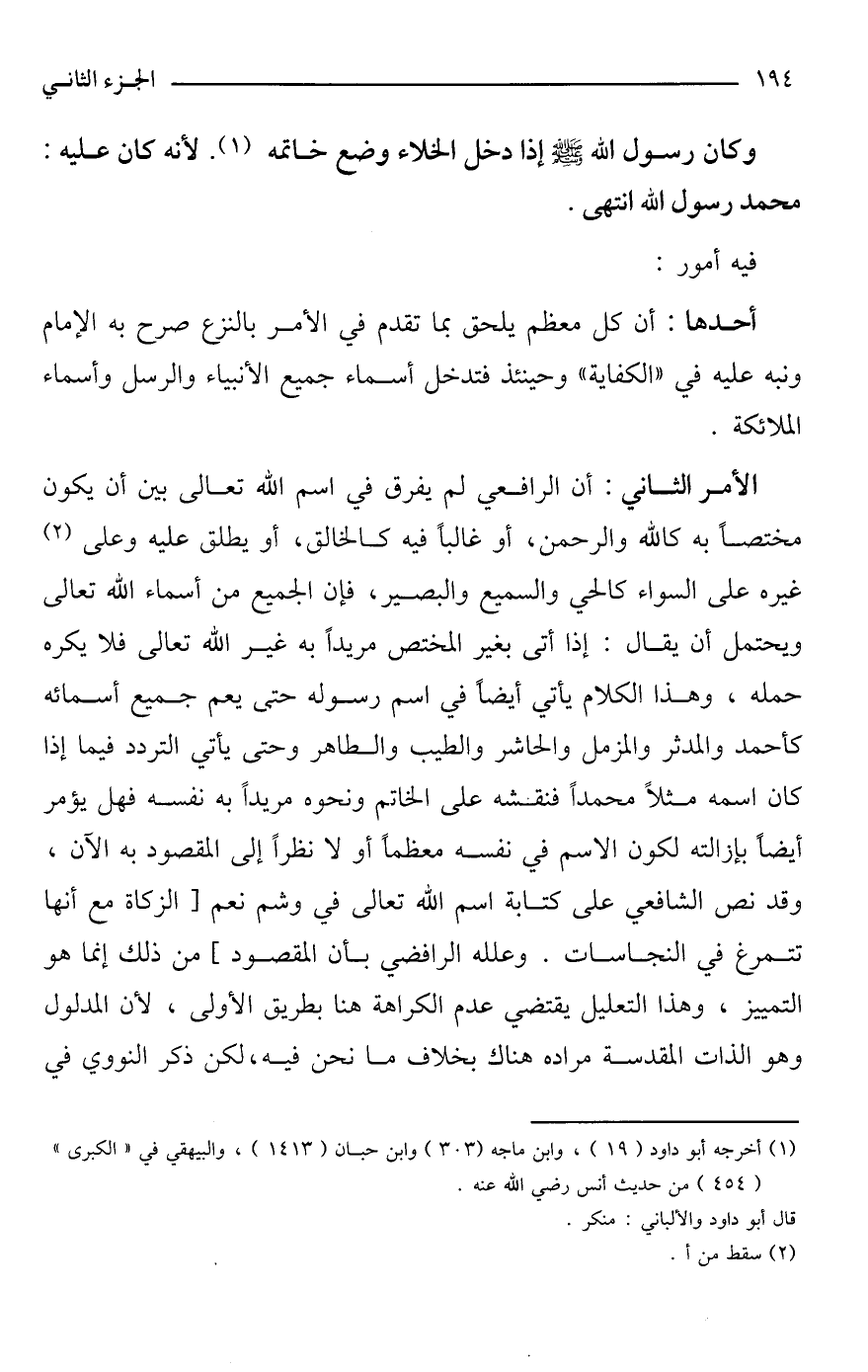 الأمر الثاني: أن الرافعي لم يفرق في اسم الله تعالى بين أن يكون مختصًا به كالله والرحمن، أو غالبًا فيه كالخالق، أو يطلق عليه وعلى (¬2) غيره على السواء كالحي والسميع والبصير، فإن الجميع من أسماء الله تعالى ويحتمل أن يقال: إذا أتى بغير المختص مريدًا به غير الله تعالى فلا يكره حمله، وهذا الكلام يأتي أيضًا في اسم رسوله حتى يعم جميع أسمائه كأحمد والمدثر والمزمل والحاشر والطيب والطاهر وحتى يأتي التردد فيما إذا كان اسمه مثلًا محمدًا فنقشه على الخاتم ونحوه مريدًا به نفسه فهل يؤمر أيضًا بإزالته لكون الاسم في نفسه معظمًا أو لا نظرًا إلى المقصود به الآن، وقد نص الشافعي على كتابة اسم الله تعالى في وشم نعم [الزكاة مع أنها تتمرغ في النجاسات. وعلله الرافضي بأن المقصود] من ذلك إنما هو التمييز، وهذا التعليل يقتضي عدم الكراهة هنا بطريق الأولى، لأن المدلول وهو الذات المقدسة مراده هناك بخلاف ما نحن فيه، لكن ذكر النووي في