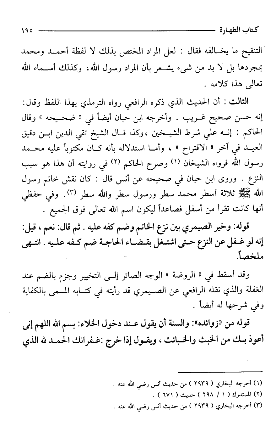 الثالث: أن الحديث الذي ذكره الرافعي رواه الترمذي بهذا اللفظ وقال: إنه حسن صحيح غريب. وأخرجه ابن حبان أيضًا في "صحيحه" وقال الحاكم: إنه علي شرط الشيخين، وكذا قال الشيخ تقي الدين ابن دقيق العيد في آخر "الاقتراح"، وأما استدلاله بأنه كان مكتوبًا عليه محمد رسول الله فرواه الشيخان (¬1) وصرح الحاكم (¬2) في روايته أن هذا هو سبب النزع. وروى ابن حبان في صحيحه عن أنس قال: كان نقش خاتم رسول الله - صَلَّى اللَّهُ عَلَيْهِ وَسَلَّمَ - ثلاثة أسطر محمد سطر ورسول سطر والله سطر (¬3). وفي حفظي أنها كانت تقرأ من أسفل فصاعدًا ليكون اسم الله تعالى فوق الجميع.