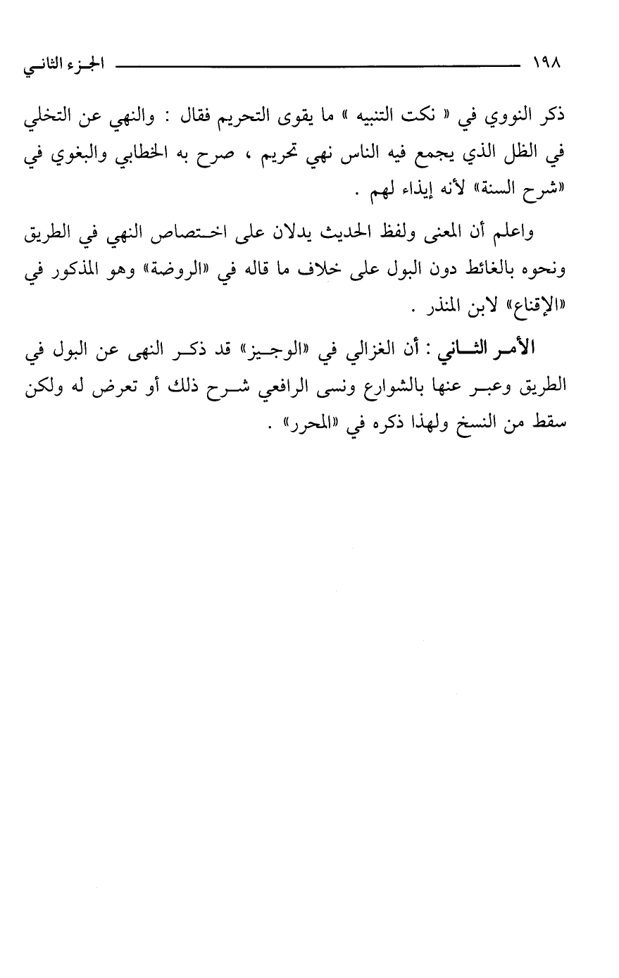 الأمر الثاني: أن الغزالي في "الوجيز" قد ذكر النهي عن البول في الطريق وعبر عنها بالشوارع ونسى الرافعي شرح ذلك أو تعرض له ولكن سقط من النسخ ولهذا ذكره في "المحرر".