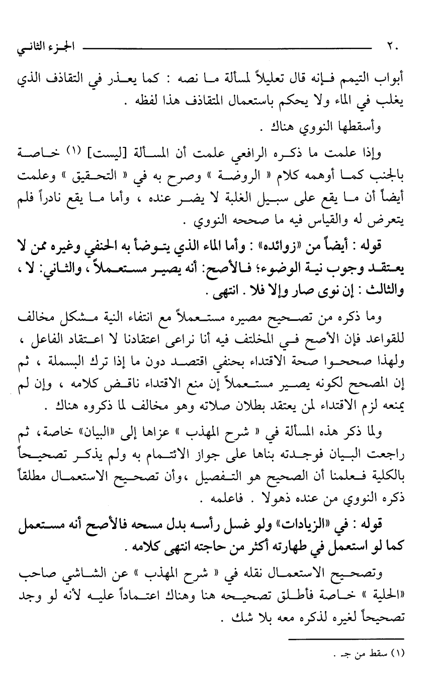 ولما ذكر هذه المسألة في "شرح المهذب" عزاها إلى "البيان" خاصة، ثم راجعت البيان فوجدته بناها على جواز الائتمام به ولم يذكر تصحيحًا بالكلية فعلمنا أن الصحيح هو التفصيل، وأن تصحيح الاستعمال مطلقًا ذكره النووي من عنده ذهولا. فاعلمه.