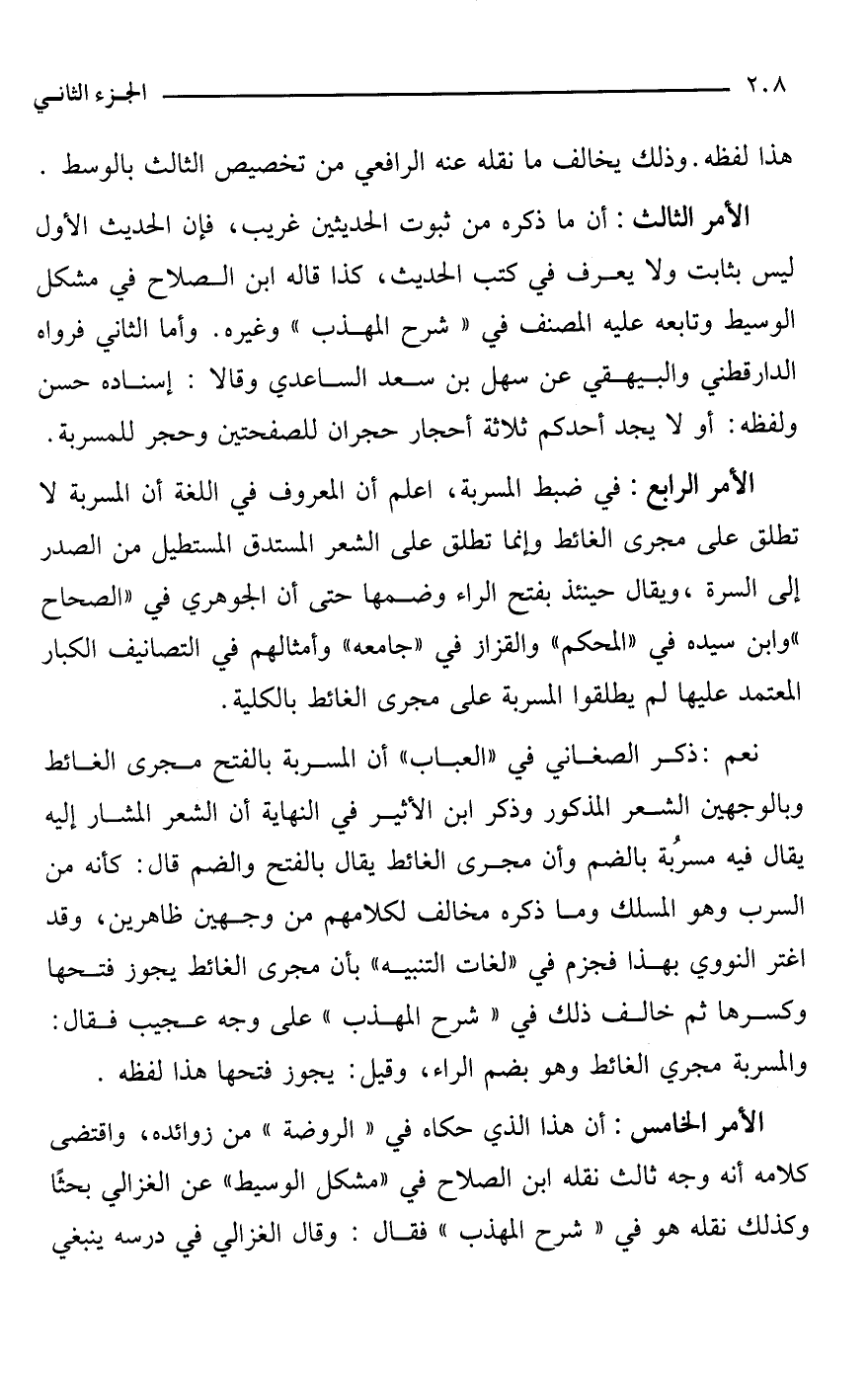 الأمر الرابع: في ضبط المسربة، اعلم أن المعروف في اللغة أن المسربة لا تطلق على مجرى الغائط وإنما تطلق على الشعر المستدق المستطيل من الصدر إلى السرة، ويقال حينئذ بفتح الراء وضمها حتى أن الجوهري في "الصحاح" وابن سيده في "المحكم" والقزاز في "جامعه" وأمثالهم في التصانيف الكبار المعتمد عليها لم يطلقوا المسربة على مجرى الغائط بالكلية.