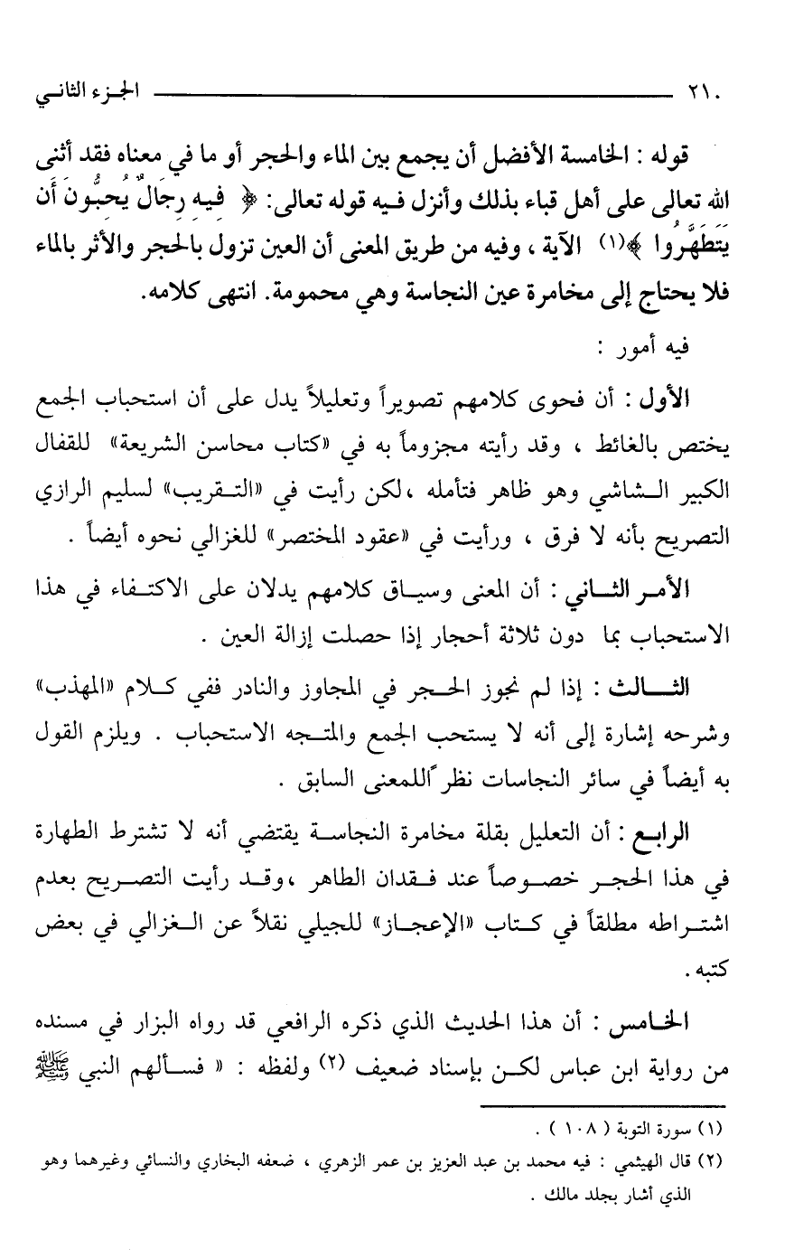 قوله: الخامسة الأفضل أن يجمع بين الماء والحجر أو ما في معناه فقد أثنى الله تعالى على أهل قباء بذلك وأنزل فيه قوله تعالى: {فِيهِ رِجَالٌ يُحِبُّونَ أَنْ يَتَطَهَّرُوا} (¬1) الآية، وفيه من طريق المعنى أن العين تزول بالحجر والأثر بالماء فلا يحتاج إلى مخامرة عين النجاسة وهي محمومة. انتهى كلامه.