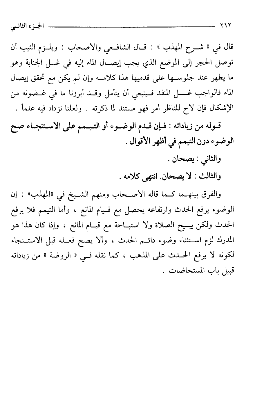 والفرق بينهما كما قاله الأصحاب ومنهم الشيخ في "المهذب": إن الوضوء يرفع الحدث وارتفاعه يحصل مع قيام المانع، وأما التيمم فلا يرفع الحدث ولكن يبيح الصلاة ولا استباحة مع قيام المانع، وإذا كان هذا هو المدرك لزم استثناء وضوء دائم الحدث، وألا يصح فعله قبل الاستنجاء لكونه لا يرفع الحدث على المذهب، كما نقله في "الروضة" من زياداته قبيل باب المستحاضات.