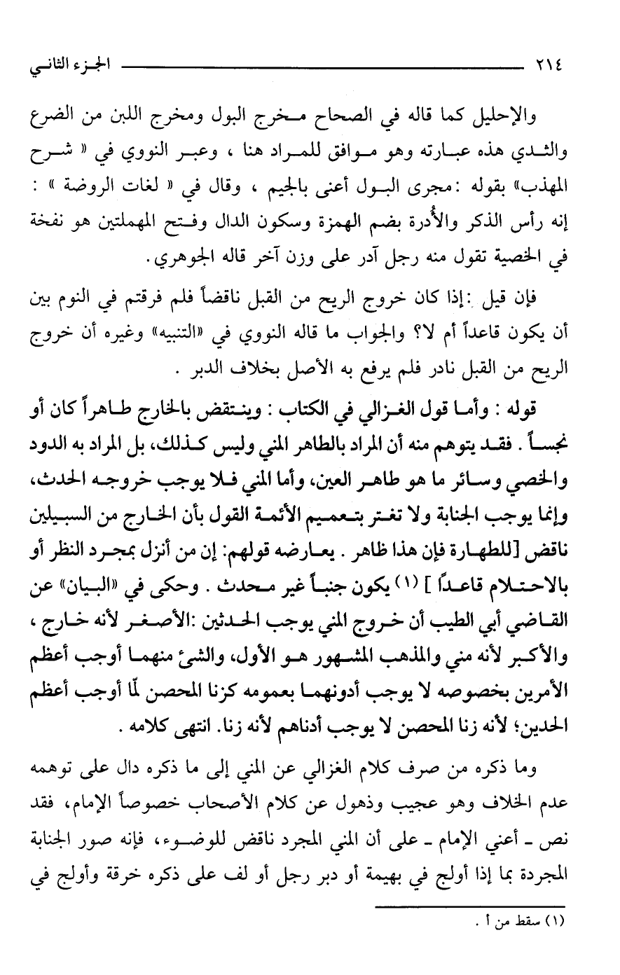 وما ذكره من صرف كلام الغزالي عن المني إلى ما ذكره دال على توهمه عدم الخلاف وهو عجيب وذهول عن كلام الأصحاب خصوصًا الإمام، فقد نص -أعني الإمام- على أن المني المجرد ناقض للوضوء، فإنه صور الجنابة المجردة بما إذا أولج في بهيمة أو دبر رجل أو لف على ذكره خرقة وأولج في