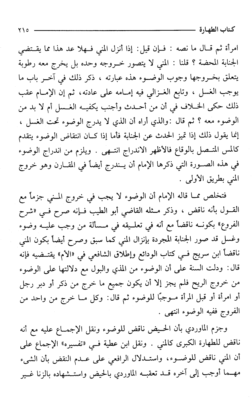 وجزم الماوردي بأن الحيض ناقض للوضوء ونقل الإجماع عليه مع أنه ناقض للطهارة الكبرى كالمني. ونقل ابن عطية في "تفسيره" الإجماع على أن المني ناقض للوضوء، واستدلال الرافعي على عدم النقض بأن الشئ مهما أوجب إلى آخره قد تعقبه الماوردي بالحيض واستشهاده بالزنا غير